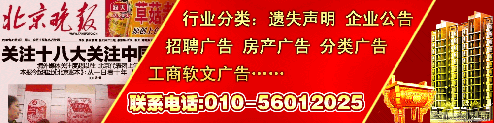 北京晚報網站 北京晚報廣告部電話 北京晚報社電話 北京晚報遺失聲明廣告 北京晚報注銷公告廣告 北京晚報企業(yè)公告廣告 北京晚報拍賣公告廣告 北京晚報出租出售廣告 北京晚報人才招聘廣告 北京晚報百貨商情廣告 北京晚報工商軟文廣告 北京晚報醫(yī)療健康廣告 北京晚報訂報 |
